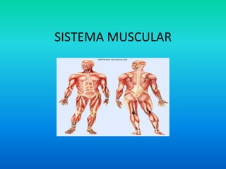 El documento describe el sistema muscular, incluyendo su definición, funciones principales, componentes y clasificación. El sistema muscular permite el movimiento del esqueleto y el funcionamiento de los órganos internos a través de tres tipos de músculos: esquelético, liso y cardíaco. Estos músculos se clasifican según su control voluntario, involuntario o autónomo y cumplen funciones vitales como la locomoción, la postura y la protección de órganos.