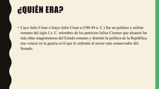 Julio César fue un político y militar romano del siglo I a.C. que alcanzó las más altas magistraturas de la República romana. Nació en el seno de una familia patricia de escasa fortuna pero emparentada con influyentes hombres como su tío Cayo Mario. Tuvo una exitosa carrera política y militar como cuestor, edil, pretor y cónsul. Como procónsul conquistó casi toda la Galia en varias campañas entre los años 58 a.C. y 50 a.C., extendiendo el dominio rom