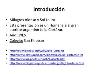 El documento presenta información biográfica sobre el escritor argentino Julio Cortázar. Nació en Bruselas en 1914 y pasó su infancia en Argentina, para luego mudarse a París en 1951 donde desarrolló su obra literaria. Cortázar es conocido por sus cuentos, novelas y ensayos y falleció en París en 1984.