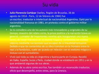 Julio Cortázar nació en Bruselas en 1914 y fue un escritor argentino reconocido por sus cuentos innovadores y novelas que rompieron con los moldes literarios clásicos. Vivió gran parte de su vida en Argentina y Europa, estableciéndose finalmente en París en 1951. Se lo considera uno de los autores más originales de su época y creador del realismo mágico. En la actualidad es ampliamente reconocido y homenajeado en Argentina, donde llevan su nombre varias escuelas, una plaza y un puente.