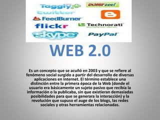 El documento describe la Web 2.0 como un concepto acuñado en 2003 que se refiere al fenómeno social surgido del desarrollo de aplicaciones en Internet que permiten una mayor interacción entre usuarios, como blogs y redes sociales, a diferencia de la Web 1.0 donde los usuarios tenían un rol más pasivo. También destaca las principales diferencias entre la Web 1.0, que tenía información estática y unidireccional, y la Web 2.0, donde los usuarios pueden generar y compartir contenido de forma colaborativa.