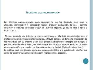 Este documento presenta los conceptos clave de la teoría de la argumentación y la retórica y su aplicación al diseño de interfaces hombre-máquina. Explica que las técnicas argumentativas pueden usarse para construir interfaces persuasivas según el público objetivo. También describe los elementos de la retórica como inventio, dispositio, elocutio y actio y cómo pueden aplicarse a las diferentes etapas del desarrollo de interfaces como la definición, conceptualización, implementación y mantenimiento.