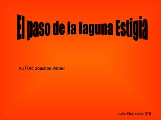 El documento describe la pintura de Joachim Patinir titulada "La Travesía del Alma por Caronte". Representa el momento en que un alma fallecida decide entre el cielo o el infierno, siendo transportada por Caronte a través de la laguna Estigia. En la pintura se aprecian detalles como Caronte, Cerbero y ángeles, así como la diferencia de paisajes entre el cielo y el infierno.