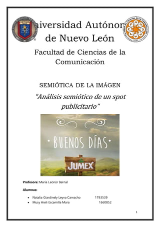 Este documento presenta un análisis semiótico de un spot publicitario de la marca Jumex. Resume la historia de la marca desde su fundación en 1961 y su evolución a través de los años. Luego, analiza elementos visuales y lingüísticos del spot publicitario actual de Jumex, el cual usa la canción "Buenos Días" de Juan Gabriel para promover la idea de la felicidad y la vida que representa su producto. Finalmente, identifica el mercado meta de Jumex como niños.