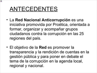 Este documento describe un proyecto para fortalecer la transparencia y el acceso a la información pública en la región de Junín, Perú. El proyecto busca promover la institucionalización de políticas de transparencia a través de la creación de un comité de seguimiento, capacitaciones a funcionarios públicos, y una campaña de sensibilización ciudadana. Según un informe, el portal de transparencia del gobierno regional cumple actualmente con el 63% de la ley de transparencia. El proyecto tiene como objetivo mejorar este cumpl
