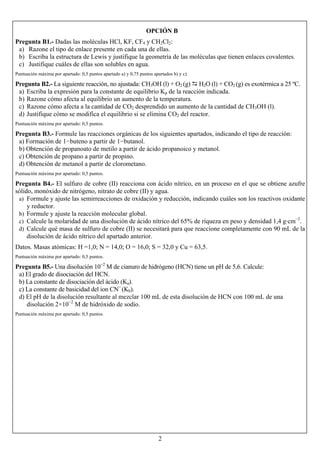 Este documento presenta las instrucciones y criterios de calificación para una prueba de química que consta de dos opciones (A y B) con cinco preguntas cada una. Los estudiantes deben escoger una opción y responder sus cinco preguntas en un máximo de una hora y media. Cada pregunta vale hasta dos puntos según la claridad, uso de lenguaje químico, capacidad de análisis y aplicación de conceptos.