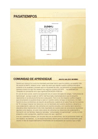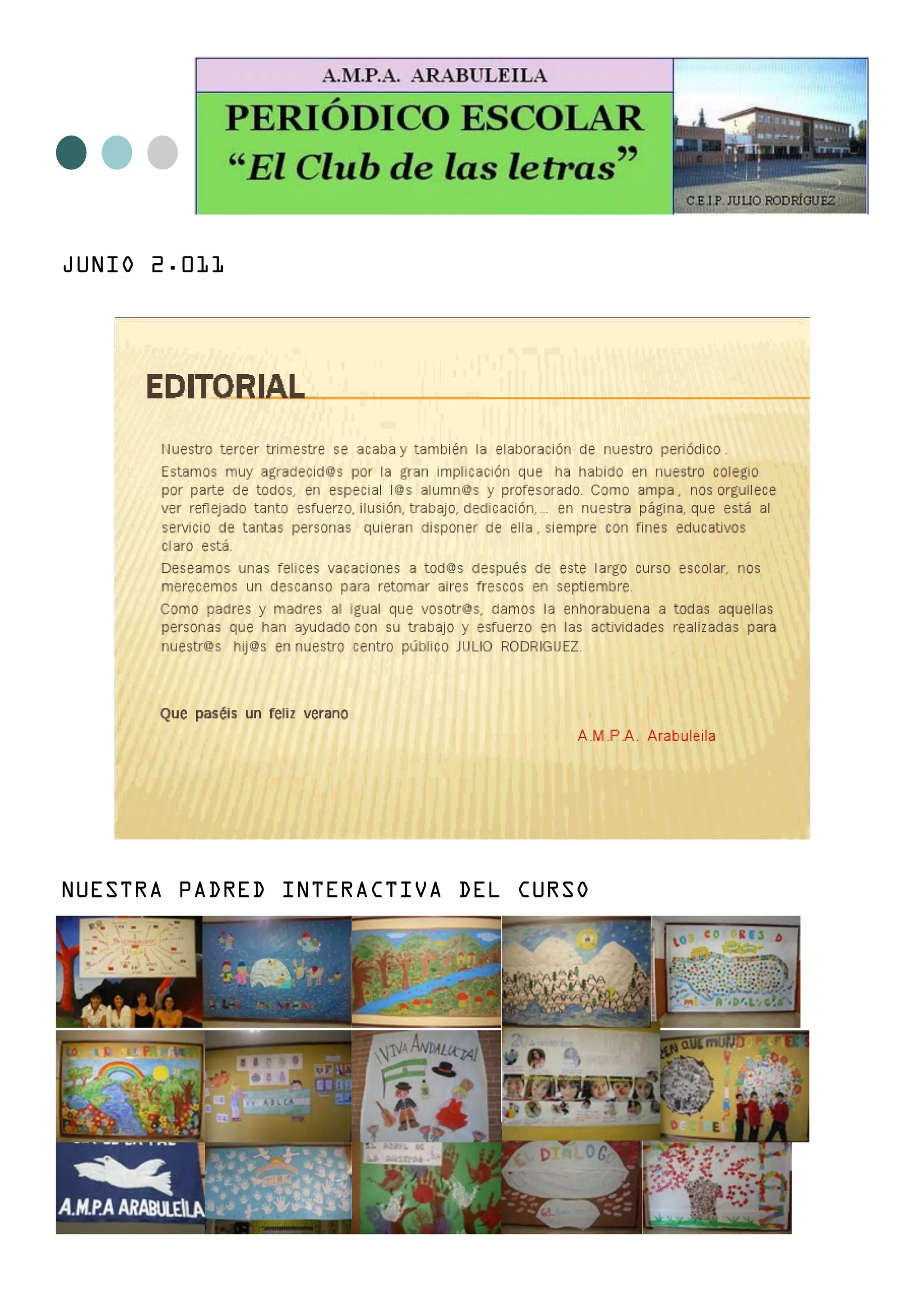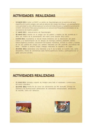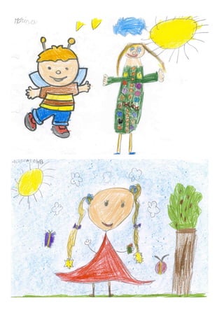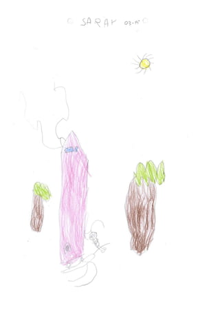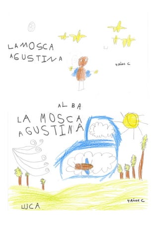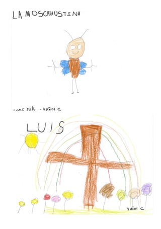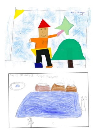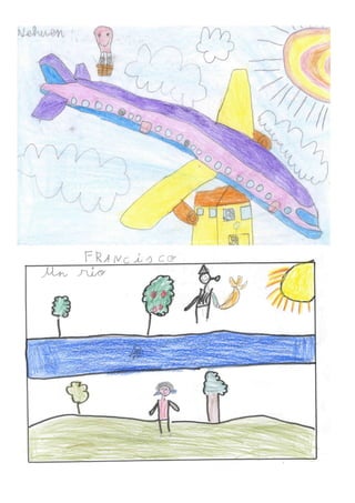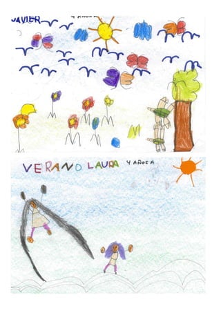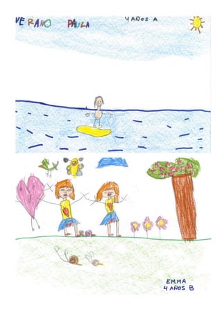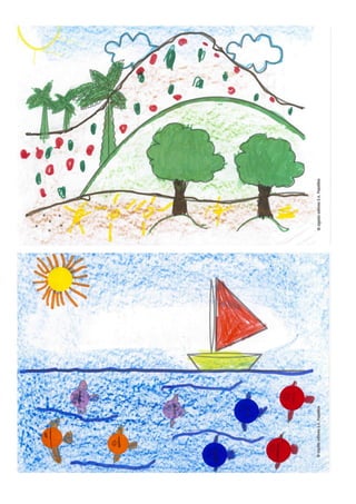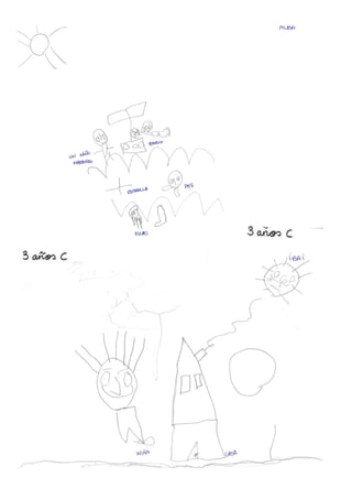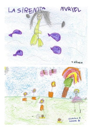 El documento presenta los trabajos realizados por los alumnos de diferentes cursos de una escuela, incluyendo alumnos de 3, 4 y 5 años de edad y de los cursos de 1o, 2o y 6o. Cada sección muestra las creaciones de los estudiantes de ese nivel educativo.