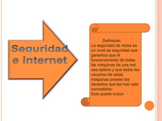 El documento define la seguridad de redes como garantizar el funcionamiento óptimo de todas las máquinas de una red y los derechos de los usuarios. Esto incluye estados de inseguridad activa por falta de conocimiento del usuario y estados pasivos por falta de conocimiento del administrador sobre mecanismos de seguridad. La seguridad de redes protege los recursos, datos, imagen de la empresa y garantiza autenticación, confidencialidad e integridad de la información intercambiada.