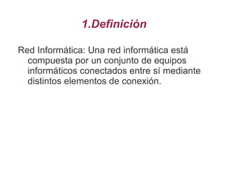 Este documento habla sobre las redes informáticas, incluyendo definiciones de diferentes tipos de redes, elementos clave como tarjetas de red, switches y routers. También cubre temas como redes inalámbricas, instalación de impresoras en red, virus informáticos, antivirus, cortafuegos, protocolos TCP/IP y DHCP. Finalmente, discute la creación de carpetas y grupos de trabajo compartidos.