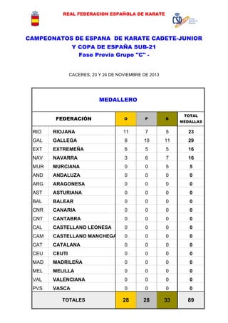 La Federación Gallega de Karate obtuvo el mayor número de medallas en los Campeonatos de España de Karate Cadete-Junior y Copa de España Sub-21 celebrados en Cáceres, mientras que la Federación Riojana ganó la mayor cantidad de oros. El documento proporciona los resultados detallados de cada categoría de kata y kumite.