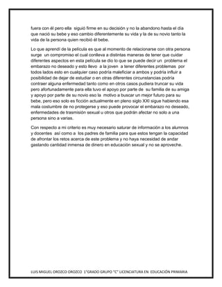 Este documento resume una película sobre una adolescente llamada Juno que queda embarazada de forma no deseada. Junto con su novio y familia, Juno decide dar al bebé en adopción a una pareja que no puede tener hijos. A pesar de enfrentar discriminación y falta de apoyo inicial, Juno logra continuar con sus estudios y dar a su bebé una mejor vida. El documento concluye que es necesario educar a estudiantes, maestros y padres sobre este tipo de temas para prevenir embarazos no deseados.