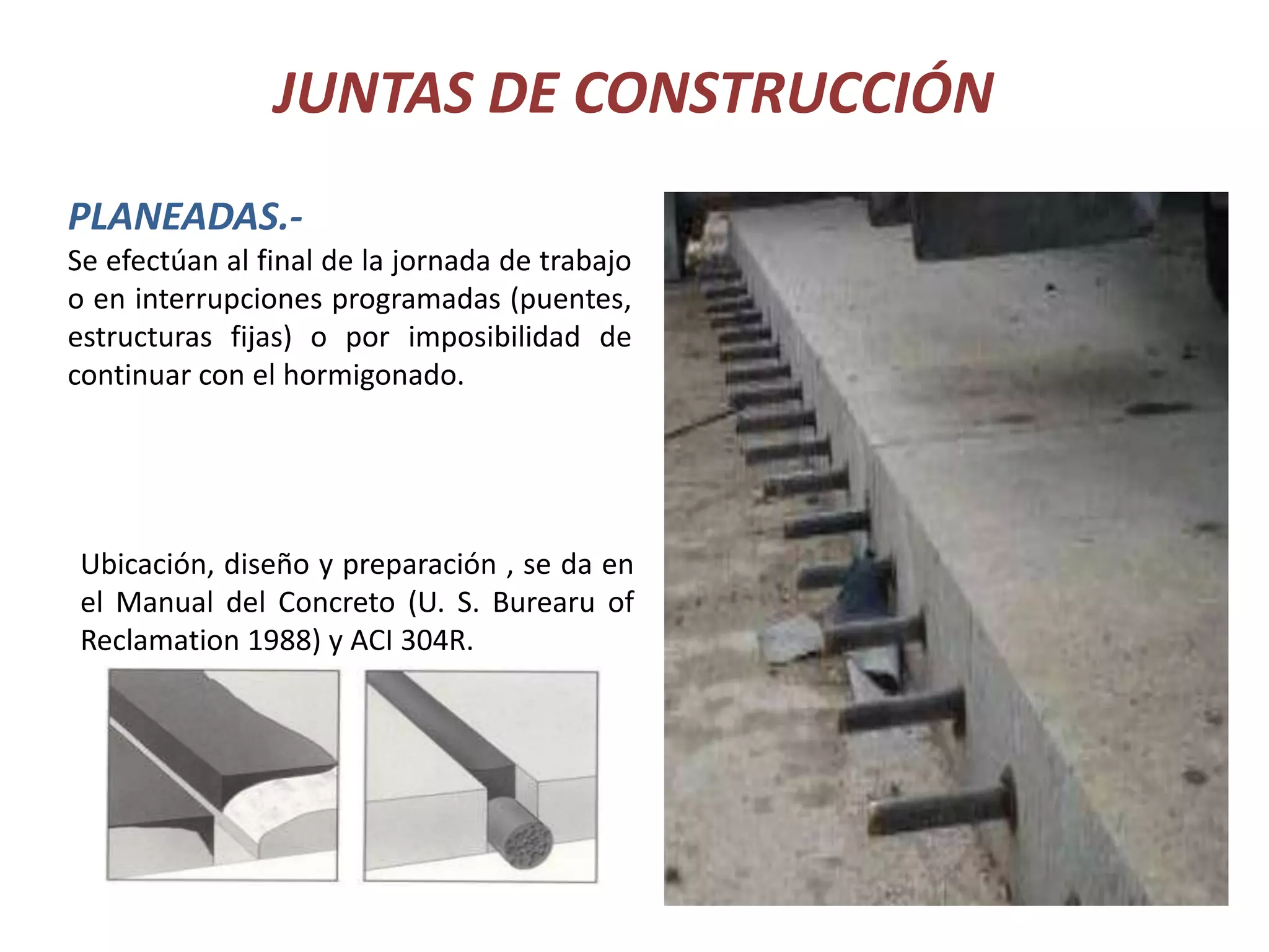 Este documento describe los tipos y uso de juntas de construcción en estructuras de concreto. Explica que las juntas planeadas se realizan al final de la jornada laboral o durante interrupciones programadas, mientras que las juntas no planeadas ocurren debido a retrasos o fallas en el suministro de concreto. Además, detalla la preparación de superficies de juntas y el uso de mezclas especiales para lograr una buena adherencia entre coladas de concreto.