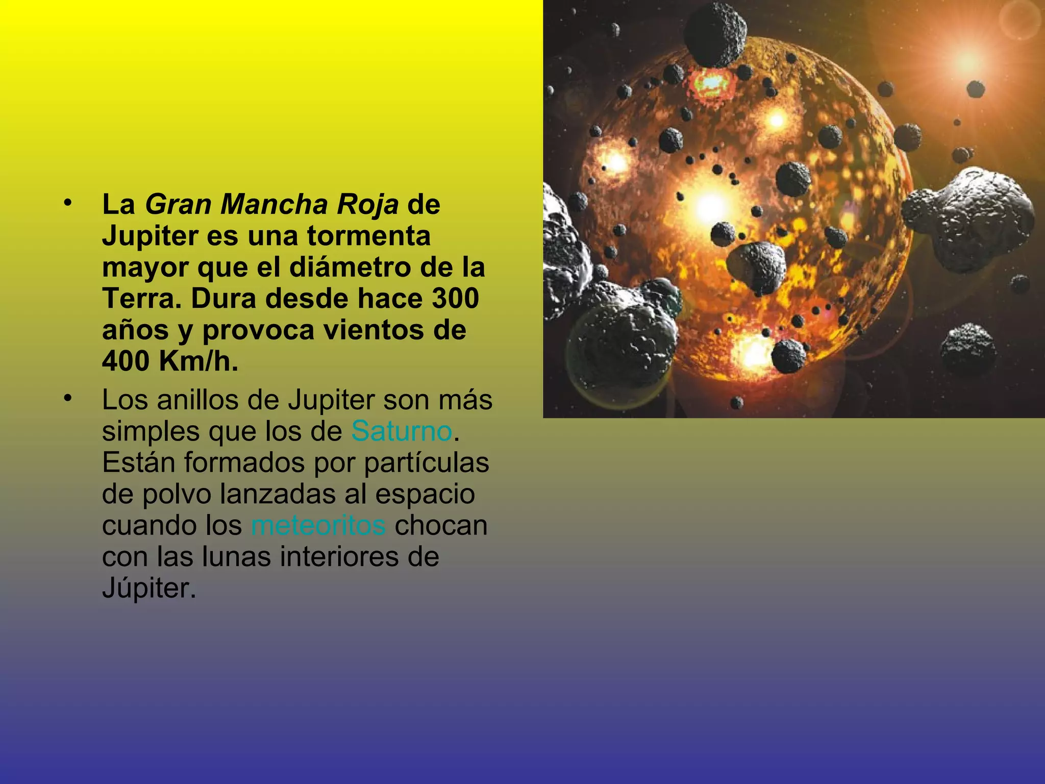 Jupiter es el planeta más grande del sistema solar. Tiene una Gran Mancha Roja que es una tormenta masiva que ha durado 300 años. Sus anillos son más simples que los de Saturno y están formados por polvo lanzado al espacio cuando meteoritos chocan con las lunas interiores. Jupiter rota más rápido que cualquier otro planeta.