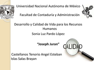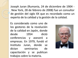 Joseph Juran fue un experto en gestión y calidad del siglo XX conocido por ayudar a mejorar la calidad en Japón a través de conferencias y asesoramiento a empresas desde 1954. Consideraba que la calidad consiste en satisfacer las necesidades de los consumidores para generar ingresos, aunque cueste más, y en evitar fallas y deficiencias, lo que generalmente cuesta menos. Propuso la "Trilogía de Juran" para gestionar la Calidad Total mediante la planificación, el control y la mejora de la calidad.