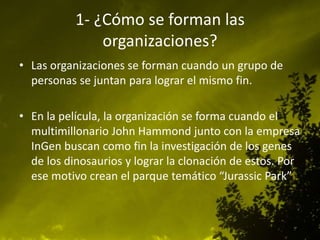 El documento resume cómo se forman las organizaciones y el contexto en el que se desarrolla la trama de la película Jurassic Park. La organización se forma cuando John Hammond y su empresa InGen buscan clonar dinosaurios para crear el parque temático Jurassic Park. La película se desarrolla a finales del siglo XX, una época en la que la tecnología avanzada permitía la clonación de dinosaurios. El avance tecnológico también influyó en las formas de trabajo de las organizaciones.