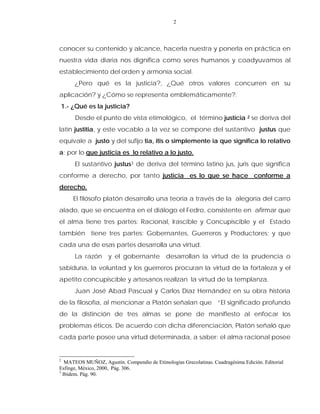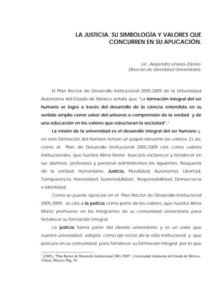 Este documento describe la justicia como un valor fundamental promovido por la Universidad Autónoma del Estado de México en su formación integral de estudiantes, profesores y personal. Explica que la justicia implica dar a cada quien lo que se merece de acuerdo a la ley y la igualdad. También analiza los orígenes y significados filosóficos de la justicia según Platón, Aristóteles y otros, así como su representación simbólica a través de figuras como Themis y Don Quijote.