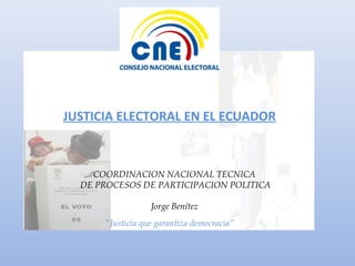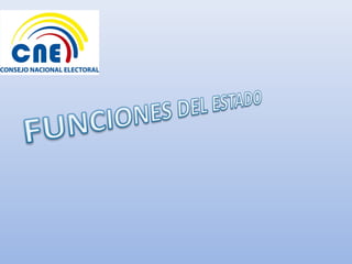 El documento resume las funciones y organización de la Función Electoral en Ecuador, incluyendo el Consejo Nacional Electoral y el Tribunal Contencioso Electoral. La Función Electoral garantiza los derechos políticos de los ciudadanos y se rige por principios de autonomía e independencia. El Tribunal Contencioso Electoral conoce recursos electorales y sanciona incumplimientos de normas electorales de forma definitiva. El documento también describe infracciones y recursos electorales.