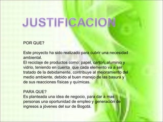 Este documento describe un proyecto de reciclaje para ayudar al medio ambiente y proporcionar empleos a jóvenes en Bogotá. La empresa se dedicará a comprar y vender papel, cartón, vidrio y otros materiales reciclables. Realizará encuestas para evaluar la cultura del reciclaje en Colombia y se ubicará en la localidad de Bosa sin generar contaminación. Los niños y jóvenes podrán intercambiar materiales reciclables por útiles escolares.