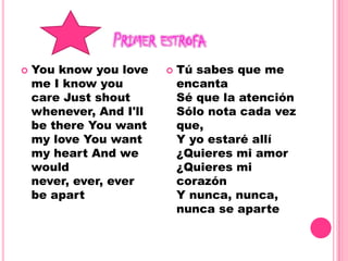 Este documento es la letra de la canción "Baby" de Justin Bieber. La canción trata sobre un amor juvenil y el dolor de una ruptura. En la primera estrofa, el cantante expresa su amor por su pareja. En la segunda estrofa, duda de su relación. En la tercera estrofa, lamenta la pérdida de su amor. En la cuarta estrofa, promete comprarle cualquier cosa para recuperarla y no puede creer que su primer amor haya terminado.