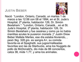Justin Bieber es un cantante pop canadiense que alcanzó la fama a través de videos musicales subidos a YouTube. Fue descubierto por un ejecutivo musical que le ofreció un contrato discográfico. Su primer sencillo y álbum tuvieron un gran éxito comercial, convirtiéndose en un fenómeno musical a nivel mundial a una edad muy temprana.