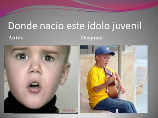 El documento resume la vida y carrera del cantante pop canadiense Justin Bieber. Fue descubierto en 2008 por el ejecutivo Scooter Braun mientras veía videos de Bieber en YouTube. Braun se convirtió en su mánager y lo presentó a Usher, con quien firmó un contrato discográfico. En 2009 lanzó su sencillo debut "One Time" y su álbum debut My World, que alcanzó el éxito comercial. Su video musical para "Baby" se convirtió en el video más visto de YouTube en 2011.