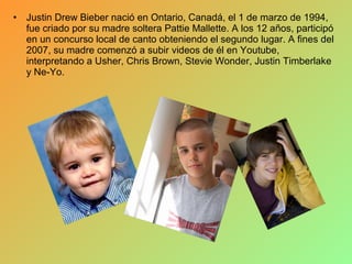Justin Bieber nació en 1994 en Canadá y fue criado por su madre soltera. En 2007, su madre comenzó a subir videos de Bieber cantando covers a YouTube, lo que llamó la atención de Scooter Brown, quien lo llevó a Atlanta para reunirse con Usher. Usher quedó impresionado y le dio a Bieber la oportunidad de grabar un álbum. El primer álbum de Bieber, My World, se lanzó en 2009 y contenía su exitoso sencillo "One Time". En 2010, lanzó su segundo álbum, My World 2.0.