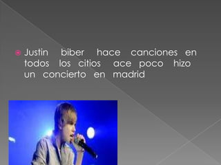 Justin Bieber es un cantante que hace canciones y se presenta en conciertos en diferentes ciudades. Recientemente tuvo un concierto en la ciudad de Madrid, España.