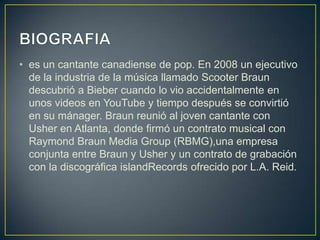 Justin Bieber es un cantante canadiense de pop que fue descubierto en YouTube en 2008 por Scooter Braun. Braun lo reunió con Usher, donde firmó un contrato musical con RBMG y un contrato de grabación con Island Records. Bieber ha tenido una relación estable con Selena Gómez por casi dos años, aunque su trabajo les ha causado problemas.