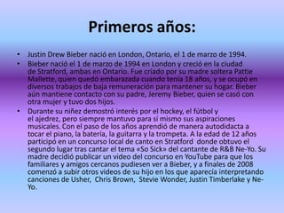 Justin Bieber nació en 1994 en Ontario, Canadá. Fue criado por su madre soltera y demostró talento musical desde una edad temprana. En 2008, el mánager Scooter Braun descubrió los videos musicales de Bieber en YouTube y lo llevó a Atlanta para grabar demos. Usher quedó impresionado y firmó a Bieber con su sello discográfico. Bieber ha lanzado varios álbumes exitosos y también ha actuado en programas de televisión y películas como el documental biográfico de 2011 Justin Bieber: Never Say Never.
