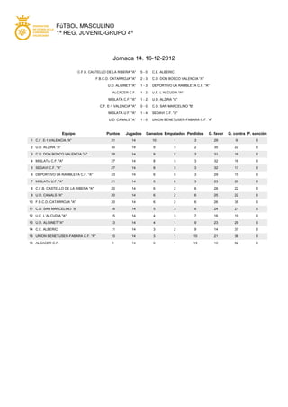 Este documento presenta los resultados de la 14a jornada de la 1a división regional juvenil masculina grupo 4. El C.F. E-1 Valencia "A" lidera la tabla con 31 puntos tras ganar 10 partidos, empatar 1 y perder 3, seguido por el U.D. Alzira "A" con 30 puntos. El Alcácer C.F. se encuentra en última posición con solo 1 punto.