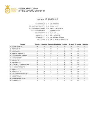 Este documento presenta los resultados de la 17a jornada de la 3a división regional juvenil masculina grupo 8. El U.E. L'Alcudia "B" lidera la tabla con 44 puntos, seguido por el SEDAVI U.E. "B" con 41 puntos y el U.D. Benimodo con 40 puntos. El U.D. Balompie Alfafar y el Catarroja C.F. ocupan los últimos puestos con 5 y 4 puntos respectivamente.