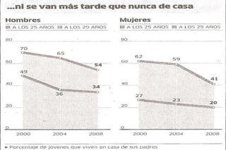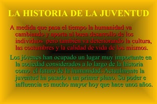 El documento analiza la evolución de la juventud a lo largo del tiempo, destacando su creciente poder e influencia en la sociedad actual, así como los problemas de adicciones y desempleo que enfrentan. Se identifica que el consumo de drogas, como el cannabis y el alcohol, es un gran problema, reflejando actitudes preocupantes entre los jóvenes españoles. La relación con la familia y la educación también es clave, pues influye en las decisiones de los jóvenes y en su integración social.