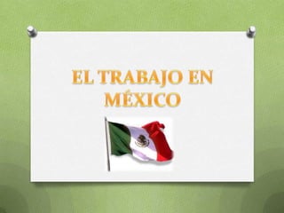 Este documento presenta información sobre las organizaciones empresariales y de trabajadores en México, así como sobre los salarios mínimos, impuestos y problemas relacionados con el trabajo. También explora temas como la deshumanización del trabajo, el sentido del trabajo desde diferentes perspectivas incluyendo las religiosas, y concluye agradeciendo la atención del lector.