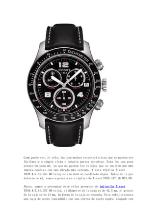 Este documento presenta una réplica de reloj Tissot T039.417.16.057.00. Describe las características del reloj, incluido su tamaño de 42.5 mm, caja de acero inoxidable, correa de cuero negro, esfera negra con agujas luminosas y cronógrafo. Aunque la réplica usa un movimiento de cuarzo japonés en lugar del movimiento original, se argumenta que esto no afectará la confiabilidad o precisión del reloj dado su bajo precio en comparación con