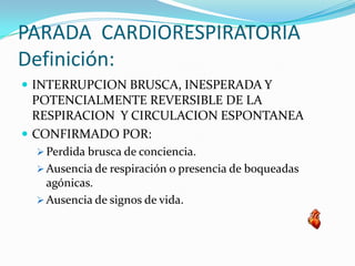 La parada cardiorespiratoria es la interrupción brusca e inesperada de la respiración y circulación espontánea. La reanimación cardiopulmonar (RCP) consiste en maniobras para sustituir primero y restaurar después la circulación y respiración mediante compresiones torácicas y ventilación. La RCP básica se realiza sin equipamiento, evaluando la conciencia, respiración y circulación de la víctima, y proporcionando 30 compresiones y 2 ventilaciones por minuto hasta que llegue ay