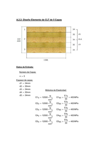 Este documento presenta el diseño de un elemento de madera contrachapada de 5 capas (CLT) sometido a carga vertical y momento flector. Se especifican las propiedades mecánicas de cada capa y las cargas aplicadas. Luego, se calculan la rigidez efectiva y las tensiones máximas en flexión del elemento mediante métodos analíticos estándar para elementos compuestos.