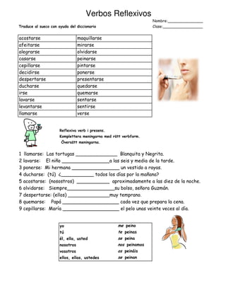 Este documento proporciona una lista de verbos reflexivos en español y ejercicios para traducir oraciones con verbos reflexivos al sueco. La lista incluye verbos comunes como acostarse, afeitarse, alegrarse y vestirse. Los ejercicios piden traducir oraciones cortas que usan estos verbos y conjugarlos en la forma reflexiva del presente.