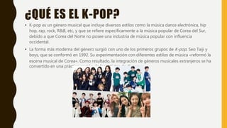 Este documento proporciona una breve introducción al género musical K-pop de Corea del Sur. Explica que el K-pop surgió en la década de 1990 e integra diversos estilos musicales occidentales. Luego menciona algunas de las bandas de K-pop más reconocidas a nivel mundial como BTS, Blackpink y Big Bang. Brevemente describe la formación y el debut de las bandas BTS y Blackpink.