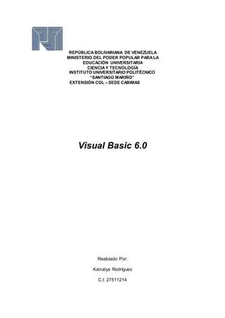 Este documento proporciona una introducción a Visual Basic 6.0. Explica los fundamentos del entorno de trabajo de Visual Basic y sus características clave. Detalla los objetos intrínsecos como etiquetas, cajas de texto y botones, y cómo se utilizan. También define conceptos como propiedades, métodos y eventos. Finalmente, resume las ventajas de Visual Basic como su curva de aprendizaje rápida y facilidad para crear aplicaciones para Windows.