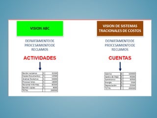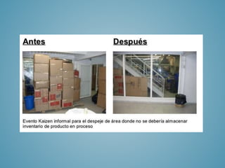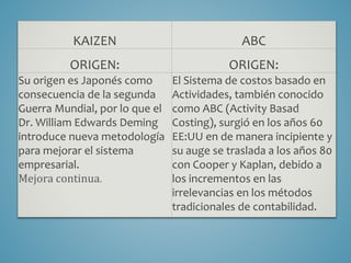 El documento compara el método Kaizen de mejora continua, originado en Japón después de la Segunda Guerra Mundial, con el método de gestión por actividades (ABC). Kaizen busca mejorar los procesos de producción eliminando desperdicios, mientras que ABC intenta gestionar la empresa identificando y analizando las actividades involucradas en la fabricación y venta de productos. Ambos métodos tienen el objetivo de hacer que las organizaciones sean más competitivas, eficaces y eficientes.