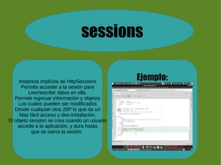 El documento describe varios objetos implícitos en JSP, como 'session', 'application', 'config' y 'request', que permiten gestionar datos y parámetros en aplicaciones web. Estos objetos se crean en momentos específicos: la 'session' al acceder a la aplicación y 'application' al iniciar el servidor. Además, se incluyen ejemplos y referencias bibliográficas relacionadas con el uso de estos objetos.