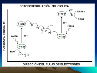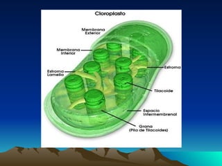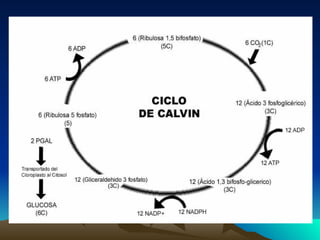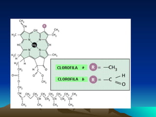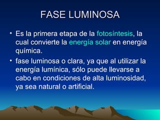 El documento habla sobre la fotosíntesis en las plantas. Explica que la fase luminosa convierte la energía solar en energía química usando la luz y los cloroplastos. Los cloroplastos contienen clorofila que absorbe la luz excepto el color verde. También describe los dos fotosistemas que trabajan juntos en la fotosíntesis y las reacciones de oscuridad que usan los productos de la luz para formar azúcares en el ciclo de Calvin.