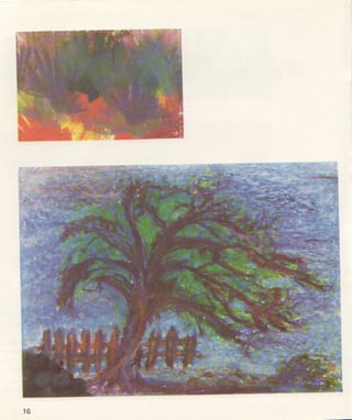 Este documento describe diferentes técnicas artísticas para crear imágenes utilizando lápices de cera. Explica cómo mezclar y aplicar los colores de los lápices de cera, y cómo utilizar técnicas como el raspadado y la combinación con pintura al agua para lograr efectos originales. También ofrece consejos sobre el trabajo con niños y la prevención de desorden.