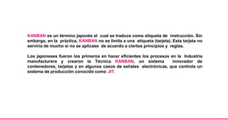 KANBAN es una técnica de producción japonesa que utiliza tarjetas para controlar el flujo de materiales a través de los procesos productivos. Las tarjetas KANBAN contienen instrucciones para cada etapa y sólo se produce lo necesario para satisfacer la demanda del cliente. El sistema KANBAN elimina el exceso de inventario, tiempos de espera y mejora la eficiencia de la producción.