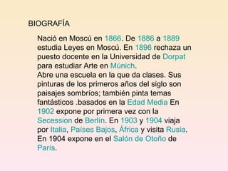 Kandinsky nació en Moscú en 1866 y estudió derecho hasta 1889, cuando decidió estudiar arte en Múnich. Sus primeras pinturas eran paisajes sombríos y temas fantásticos basados en la Edad Media. En 1902 expuso por primera vez con la Secesión de Berlín y entre 1903 y 1904 viajó por Italia, Países Bajos, África y Rusia, exponiendo en el Salón de Otoño de París en 1904. Fue un pionero de la abstracción en la pintura.