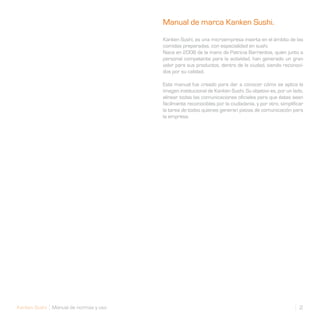 Este manual establece las normas y lineamientos para el uso adecuado de la marca Kanken Sushi. Kanken Sushi es una microempresa dedicada a la preparación de sushi en la ciudad. El manual describe los elementos de la marca como el logotipo, tipografías, colores y áreas de protección, y proporciona lineamientos para su uso correcto en diferentes aplicaciones como papelería, vehículos, uniformes, empaques y medios digitales.