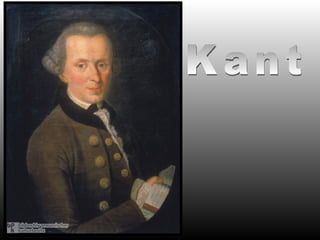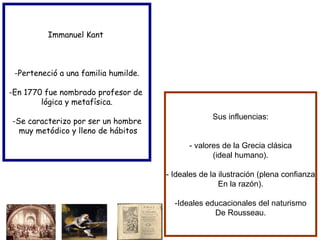 Kant provenía de una familia humilde y se caracterizó por ser metódico. En 1770 se convirtió en profesor de lógica y metafísica. Sus influencias incluyeron los ideales de la Grecia clásica, la Ilustración y la educación natural de Rousseau. Para Kant, la educación práctica debía desarrollar la habilidad, la prudencia y la moralidad. Para formar el carácter, los niños deben mostrar deberes hacia sí mismos, como la nobleza, y hacia los demás, como el resp