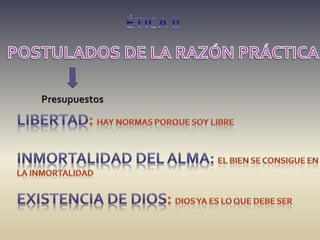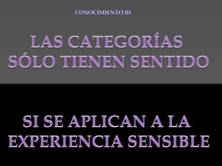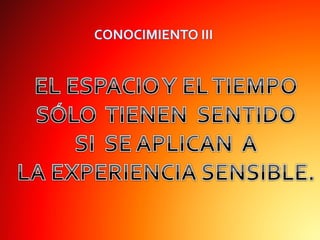 La filosofía se ocupa de tres preguntas fundamentales: cómo puedo conocer, cómo debo actuar, y qué puedo esperar. El documento analiza las diferentes formas de conocimiento y los principios del comportamiento humano de acuerdo con Kant, incluyendo sus ideas sobre el espacio, el tiempo, las categorías, los juicios sintéticos a priori, y la razón práctica. Finalmente, discute brevemente conceptos como la religión, Dios, y la política ideal según una perspectiva kantiana.