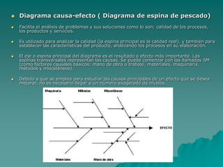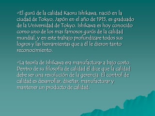 Kaoru Ishikawa fue un experto japonés en control de calidad que desarrolló herramientas como el diagrama de Ishikawa y los círculos de calidad. Nació en 1915 en Japón y se graduó de la Universidad de Tokio. Promovió la filosofía de que la calidad debe ser responsabilidad de toda la organización y no solo del departamento de control de calidad. Propuso siete herramientas básicas para el análisis de calidad como hojas de control, histogramas y diagramas de Ishikawa.
