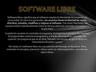 Un sistema operativo es un programa que gestiona los recursos del hardware y provee servicios a los programas de aplicación. El software libre significa que los usuarios tienen la libertad de copiar, distribuir, estudiar, modificar y mejorar el software. Los sistemas operativos libres incluyen distribuciones basadas en BSD, distribuciones de GNU/Linux, e Inferno y Plan 9 de Bell Labs.